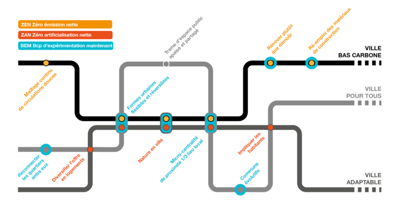 Les grands enjeux de la lutte contre les effets du réchauffement climatique nous concerne tous mais guident difficilement nos actions. C'est pourquoi nous nous attachons à mettre en perspective le diagnostic du contexte, les enjeux territoriaux et les actions à entreprendre. Pour y parvenir, nous mettons en tension les objectifs du ZEN (Zéro Emission Nette), du ZAN (Zéro Artificialisation Nette), en appelant de nos voeux l'expérimentation à travers le BEM (Beaucoup d'Expérimentations Maintenant).