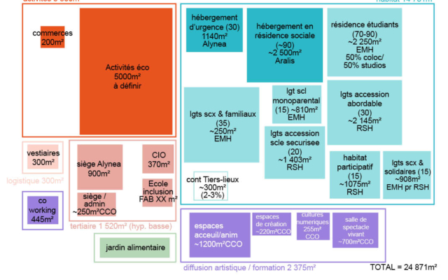 > Régénérer une friche urbaine et y implanter un ensemble de services et d’équipements variés (Logement, Hébergement d’urgence, Culture, Economie, Social) priorisant l’inclusion des personnes vulnérables et favorisant l’hybridation des activités