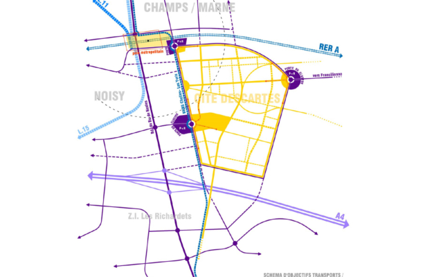 La Cité Descartes est à la convergence de multiples initiatives. L’arrivée des lignes 15 et 16 du réseau Grand Paris Express et le prolongement de la ligne 11 jusqu’à Noisy-Champs va renforcer sa position dans la métropole. Ces échéances fortes entraînent un processus de projet ambitieux.qui nécessite de :